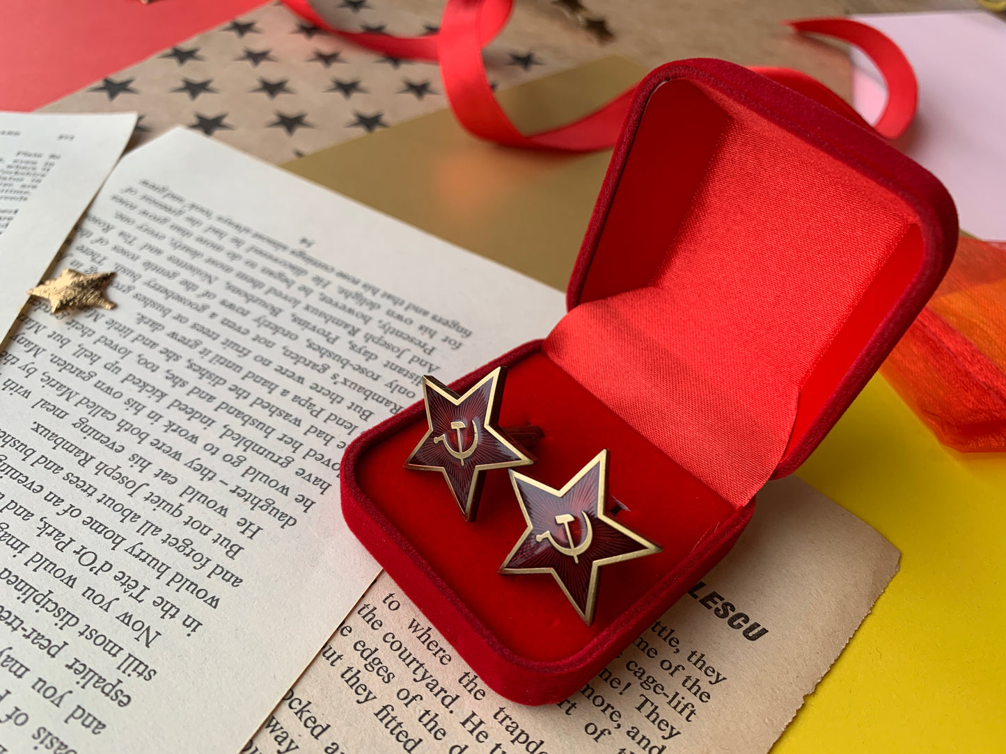 Leftist Red Star Socialist Hammer and Sickle Antique Style Gold and Prismatic Ruby Red Communist Cufflinks